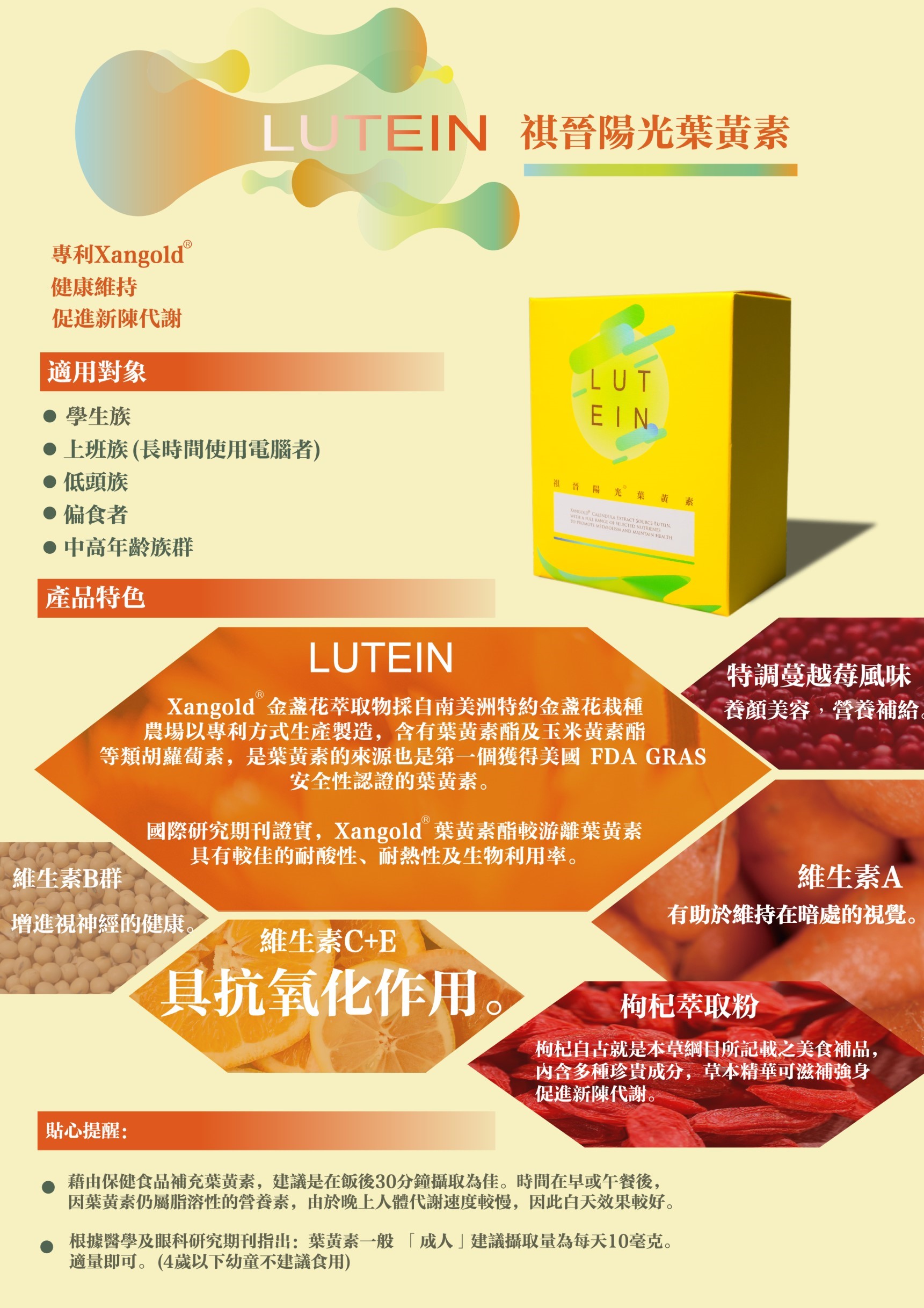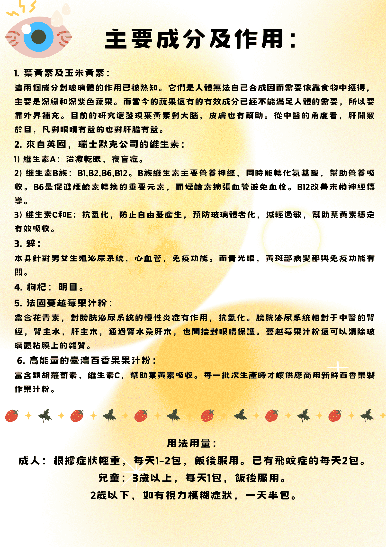成分:蔗糖、麥芽糊精、蔓越莓果汁粉、百香果果汁粉、金盞花萃取物(含葉黃素)、磷酸鈣、檸檬酸、枸杞萃取物、抗壞血酸鈉、硫酸鋅、維生素B12、維生素E、維生素A粉末、維生素B1、維生素B2、維生素B6